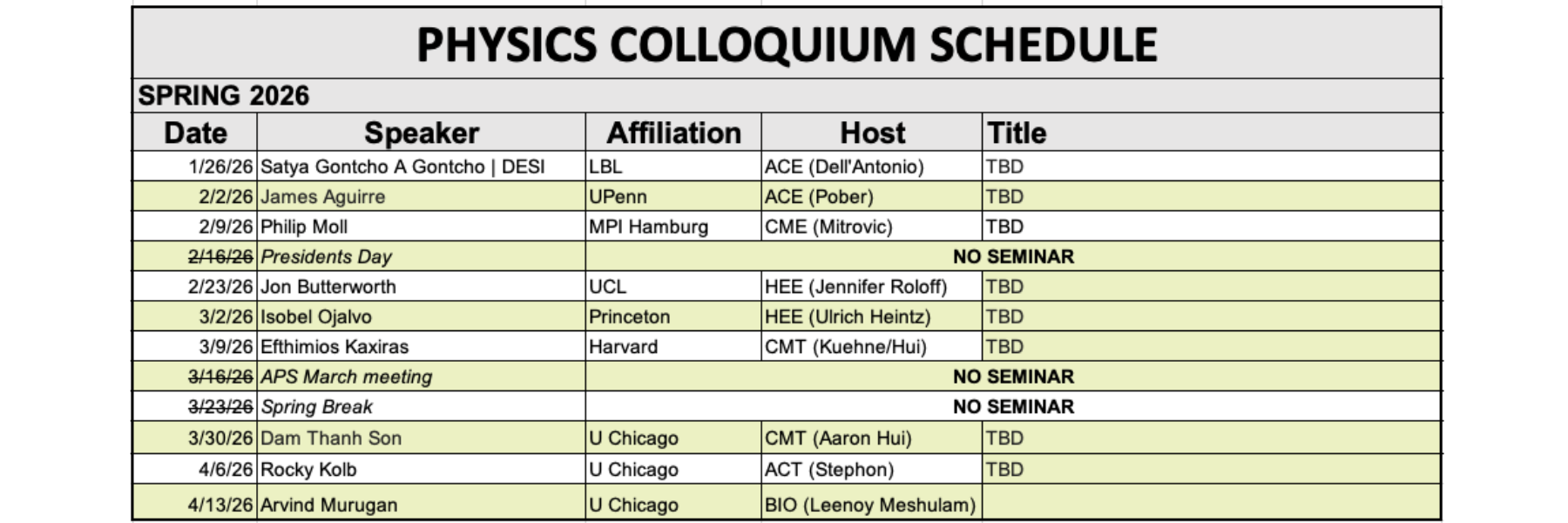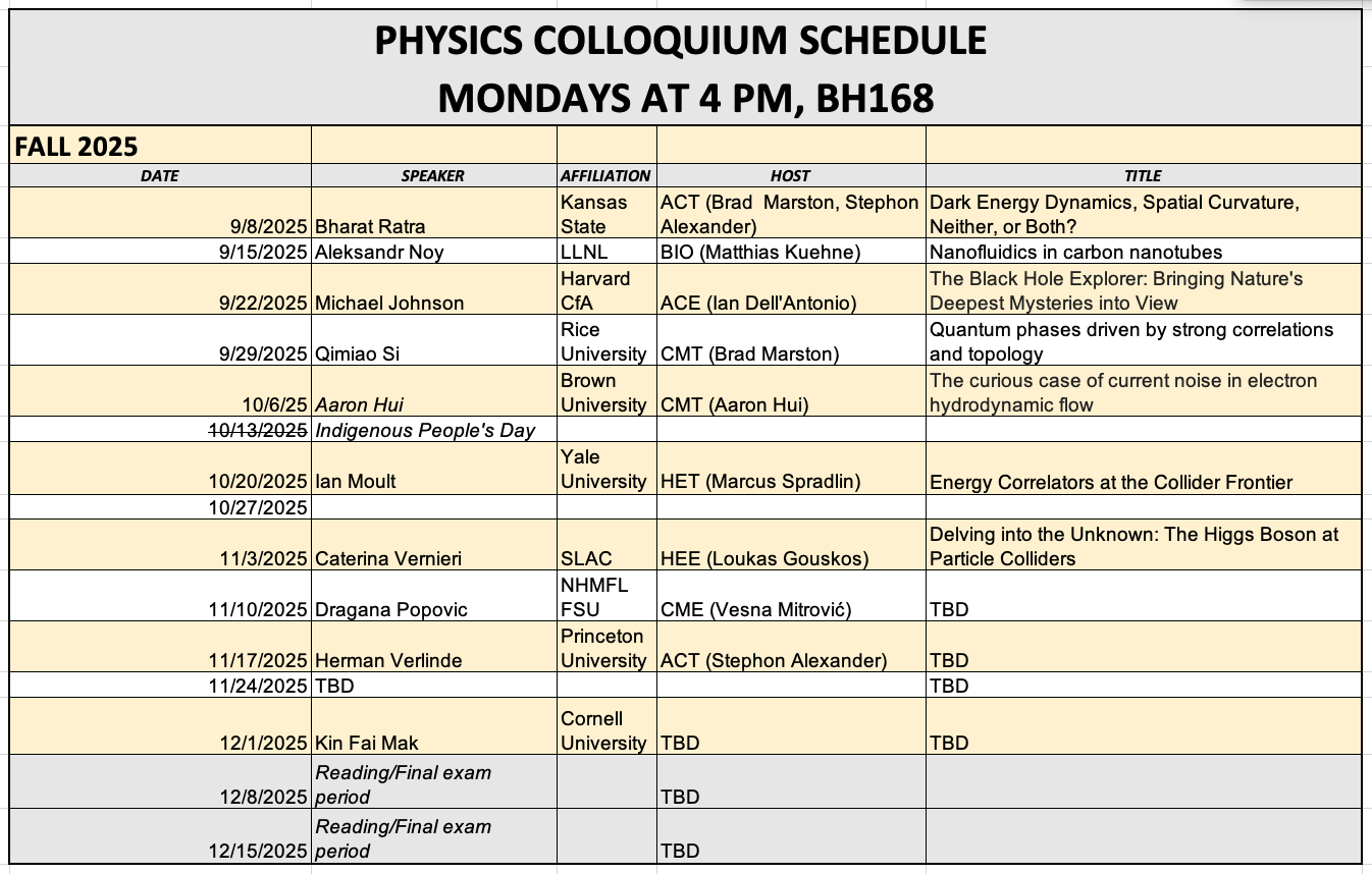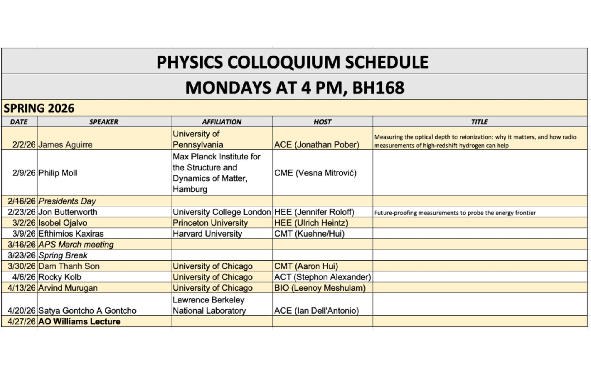 The Department of Physics is a vibrant department with faculty pursuing the frontiers of science, engineering and physics education. The Physics Colloquium hosts speakers pushing the limits of physics to detect new fundamental particles and dark matter, while others are formulating, perceiving and creating devices and materials that transform practical aspects of our daily lives. All are welcome! Mondays at 4 PM in BH168.
